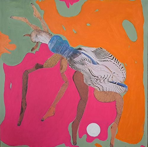 Collage mit Acrylmalerei, Acryl auf Holz, 60 x 60 cm, 2023